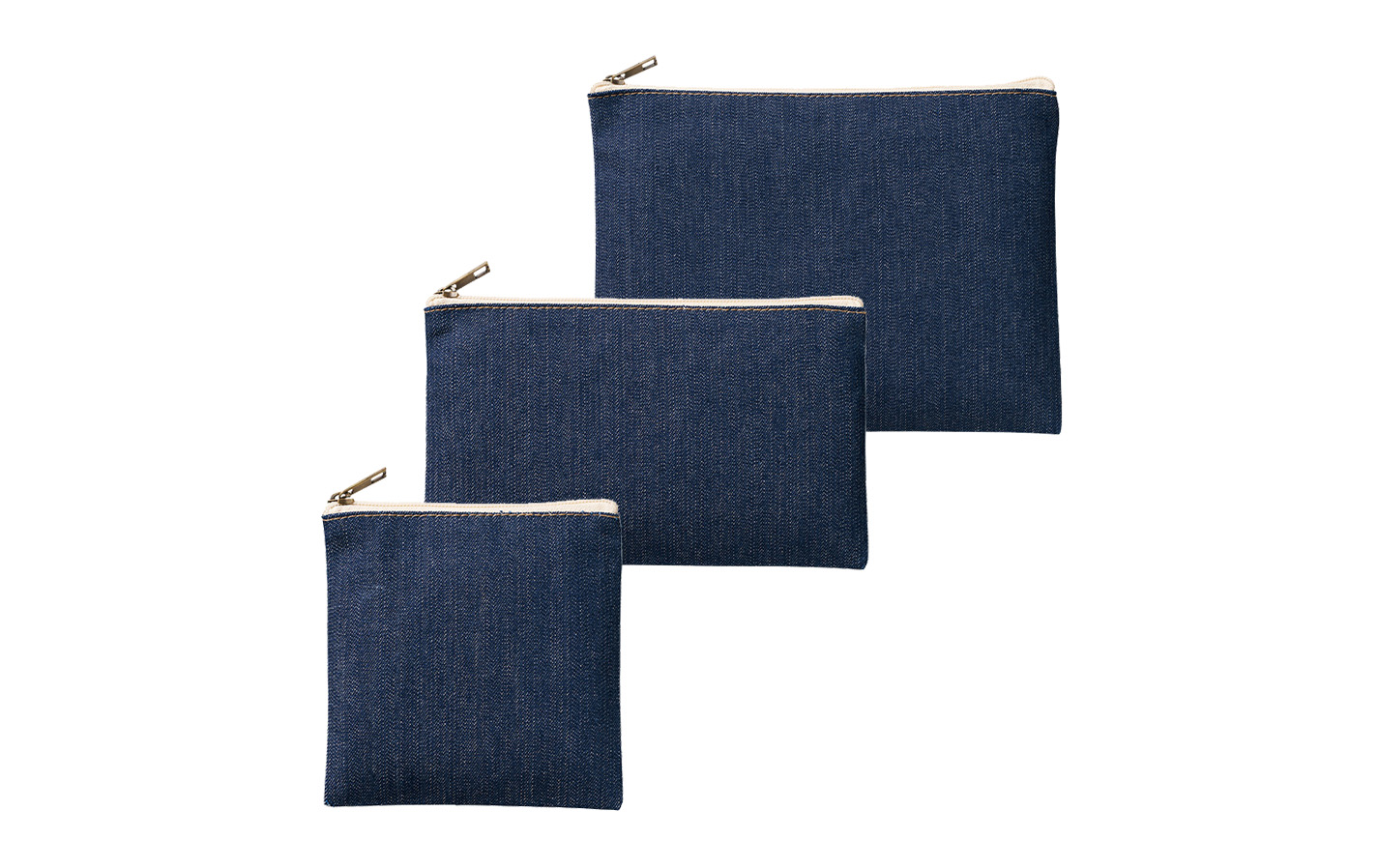 フラットタイプで使いやすい、おしゃれな印象のデニムポーチです。 SS・S・Mサイズの3サイズ展開で、Sサイズは横型なのでペンケースや、 コスメポーチなどとしてもおすすめです。 ファスナーの引き手部分はデニムと相性の良い、アンティークゴールドの色味になっています。 男女ともに使っていただきやすいカジュアルさがポイントです。 単色印刷のほか、フルカラー印刷も可能なため、ノベルティはもちろん、デニムを生かした物販品としてもご提案いただけます。
