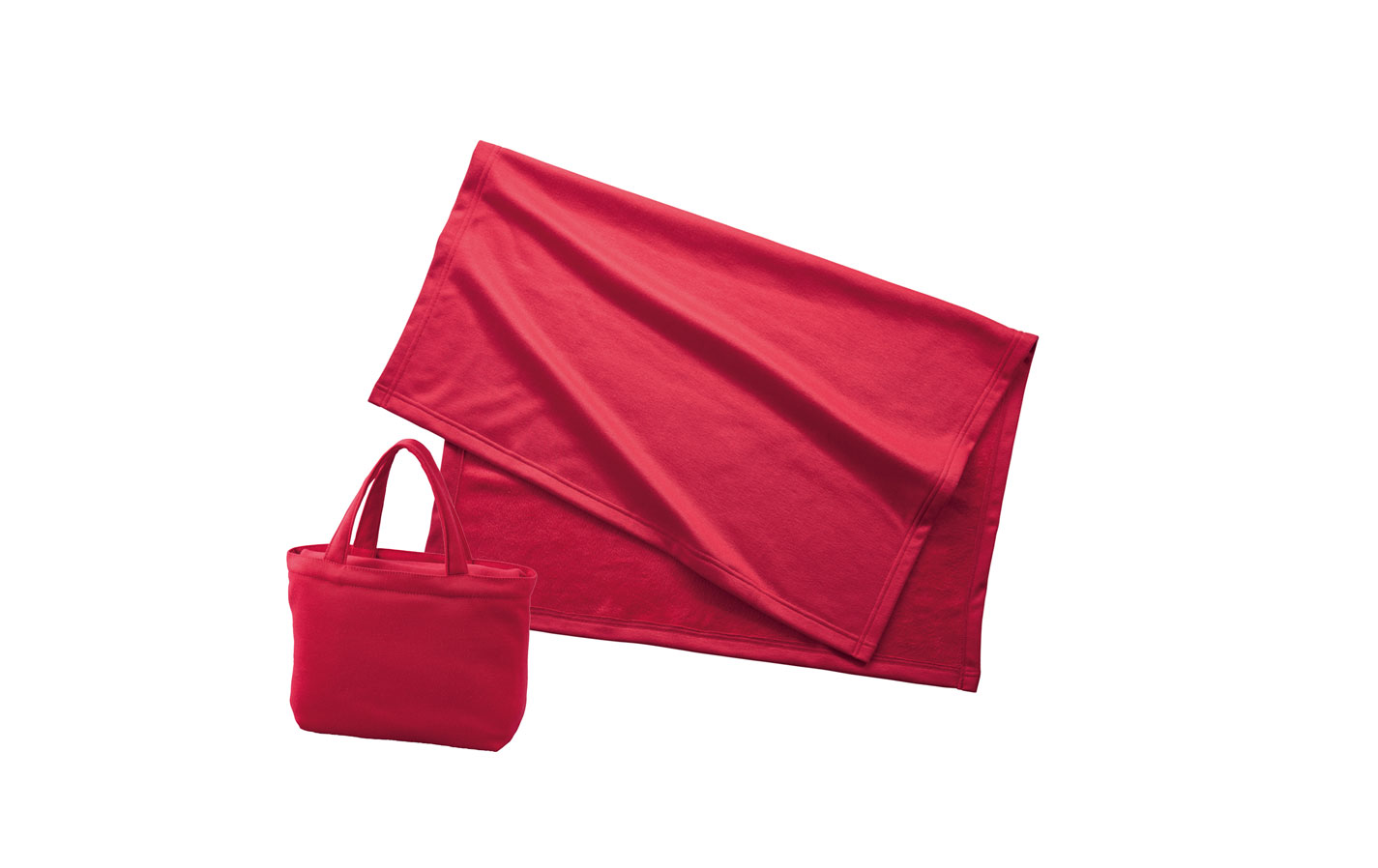 バッグ付きのブランケット。足元全体を包み込むレギュラーサイズで、名入れしやすいスムース生地とあったかなファーのダブルフェイス生地です。記念品やノベルティにおすすめで、ベーシックな4色展開。