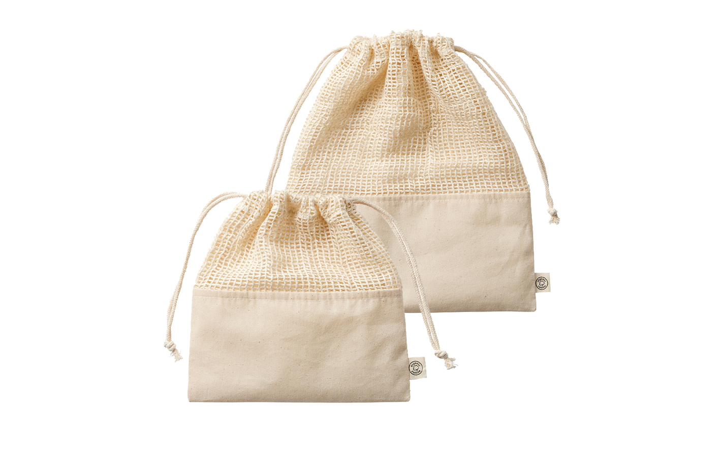 オーガニックコットンを使用したネットタイプの巾着。石油系素材を一切使用しておらず、環境にも優しいエコなアイテムです。本体上部はネット仕様となっており中に入れるものを見せて収納でき、本体下部は生地部仕様なので、本体下部から中身が飛び散る心配もこざいません。本体下部に単色からフルカラープリントまで名入れが可能のため、キャラクターデザインや企業ロゴを入れることで社内ノベルティや、販促物としても幅広く活用できるアイテムです。