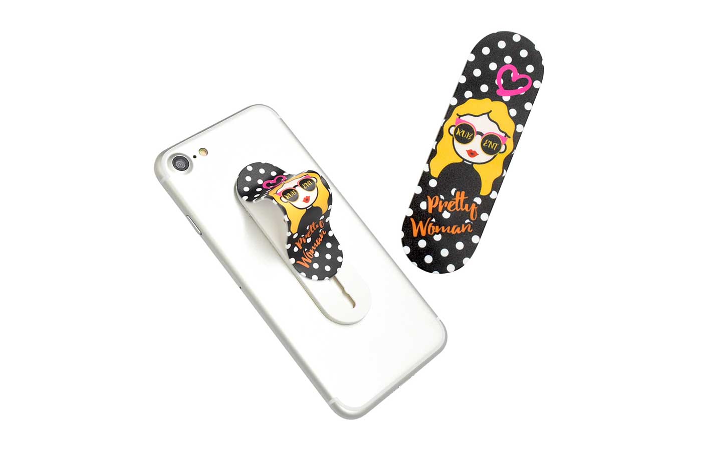 スマホの裏に貼り付けるタイプのバンドです。軽い上に、バンド部分はスライドして収納できるので邪魔になりにくいです。 バンド全体にデザインできるので総柄やキャラクターメインのデザインにもぴったり。色違いのデザインで展開もできそう!