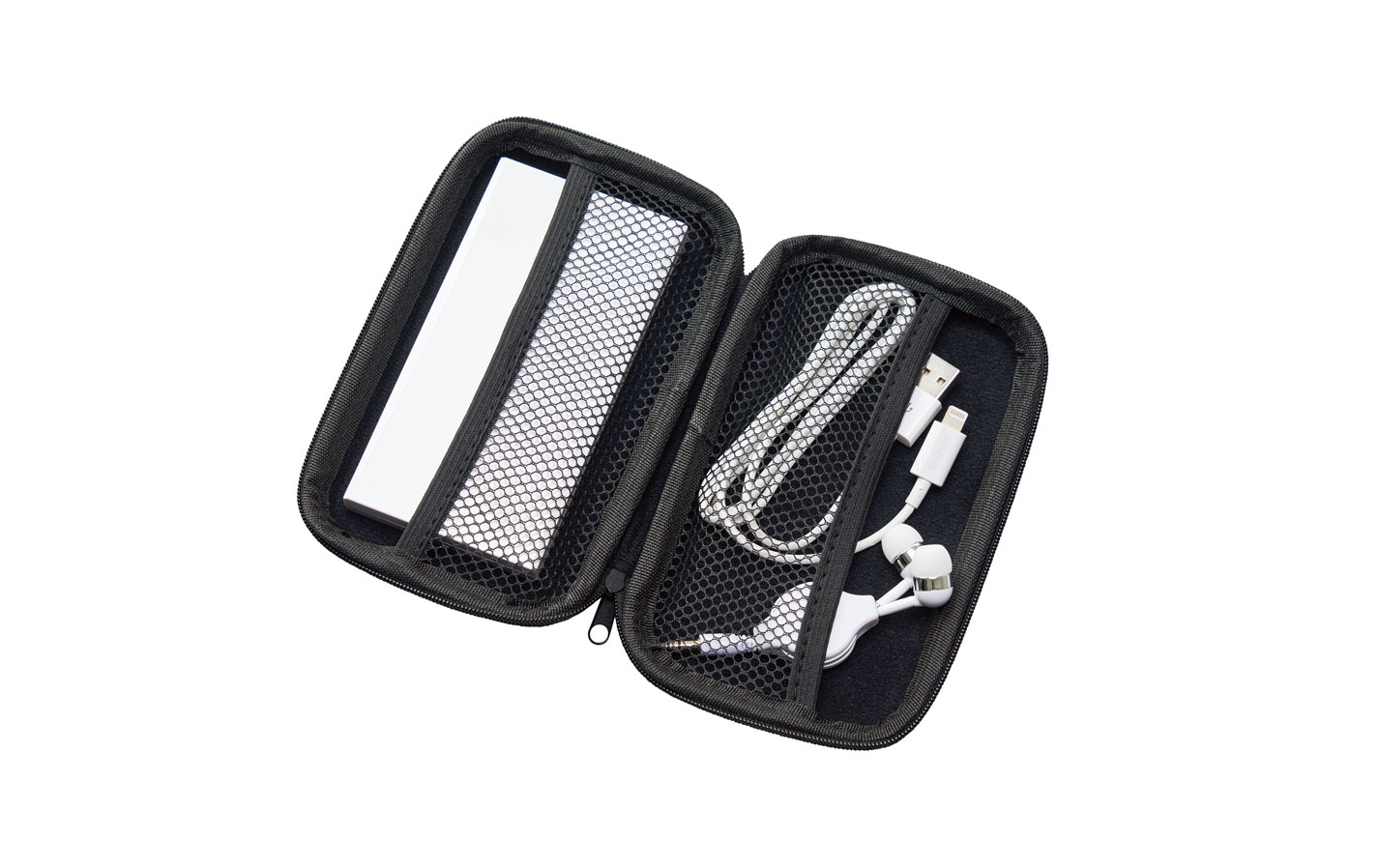 イヤホンやバッテリー、コードをまとめられるアクセサリーケース。仕分けが網で見やすく、衝撃をしっかり吸収するの安心性と実用性の高いアイテム。