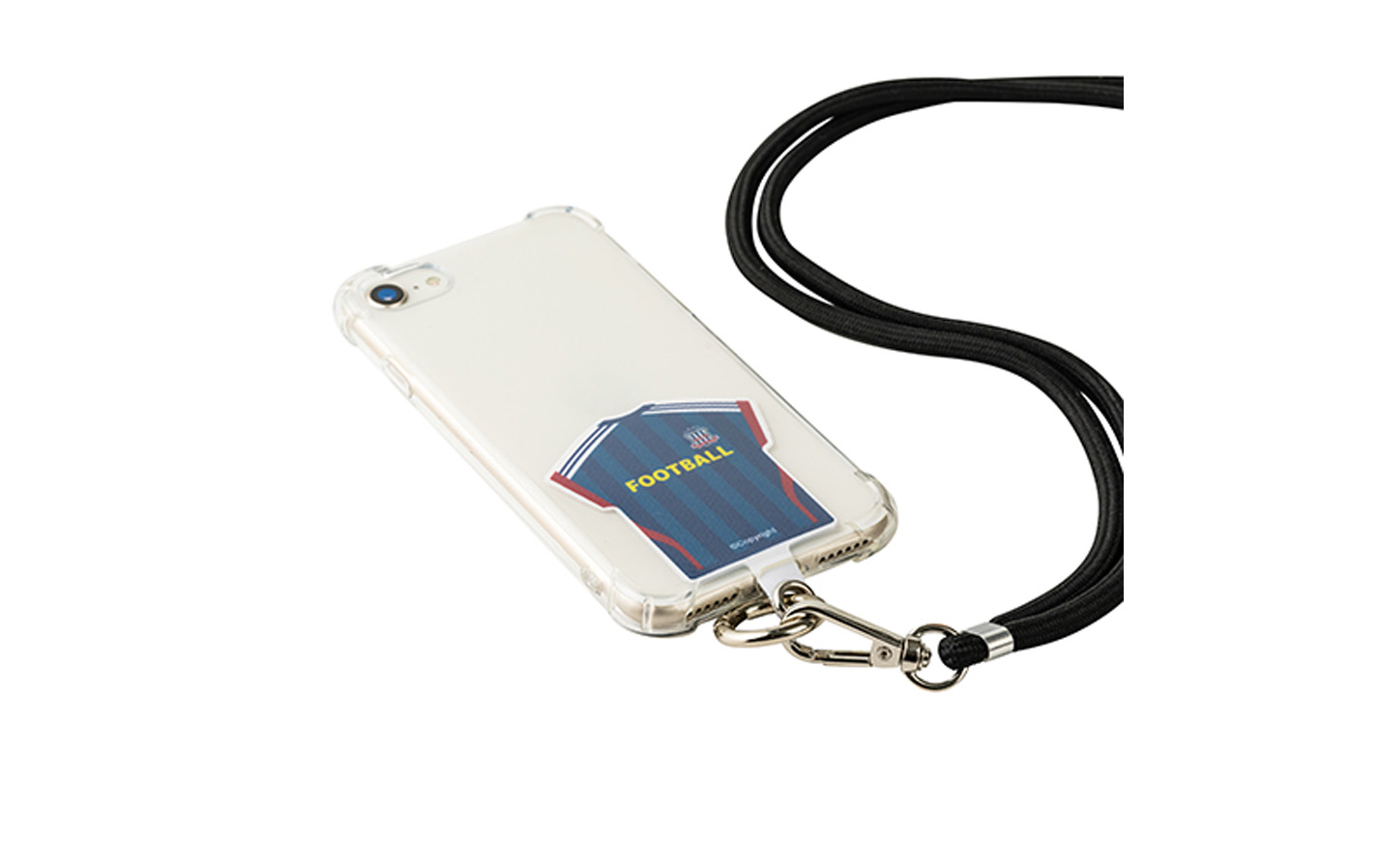 スマートフォン本体とスマートフォンケースの間に挟み込むようにして挿入することで、キーホルダーやストラップを取り付けられるようになり、ネックストラップを装着すればショルダータイプのスマートフォンケースとしても利用できるようになります。Tシャツ型に印刷を載せることでスポーツグッズやライブグッズとして活用いただけます。