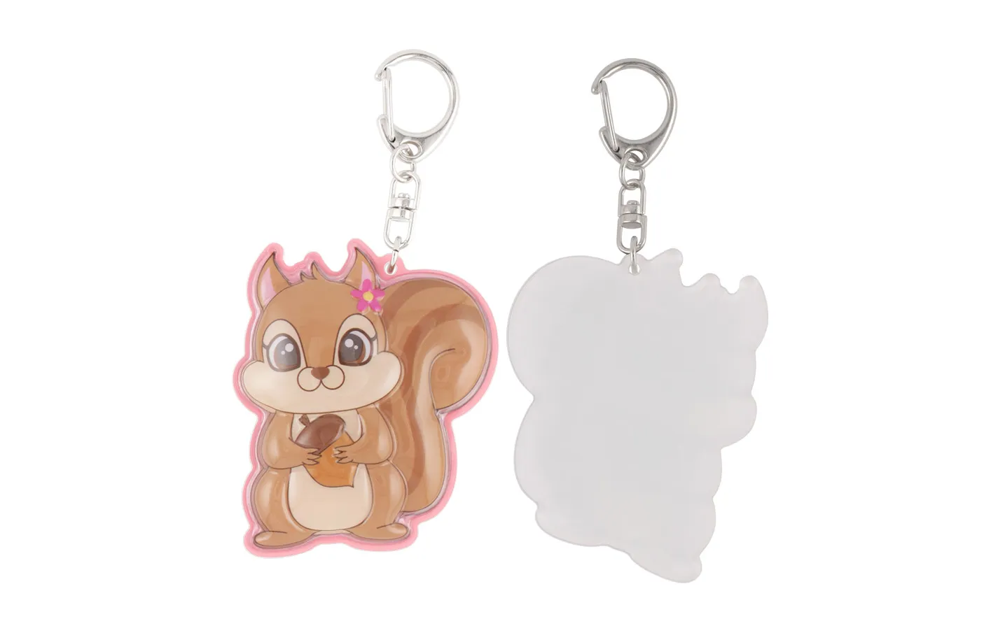 外枠のフレームの真ん中に丸カンでつないだキーホルダーがゆらゆら動いてかわいいアクリルキーホルダー。キャラクターが可愛く揺れて楽しめます。
