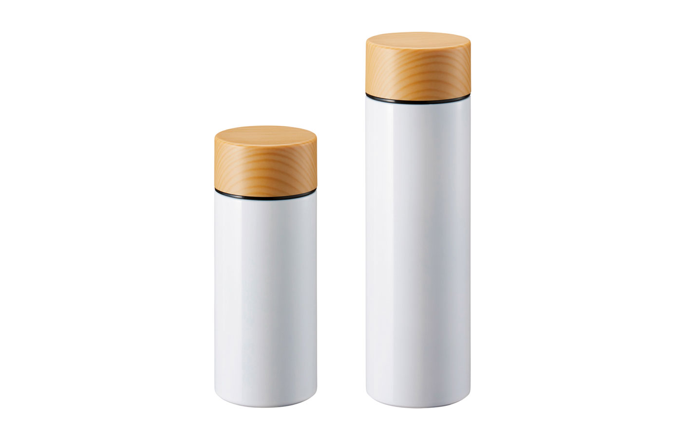 木のぬくもりを感じられるサーモステンレスボトル。温・保冷機能をもつ真空2層構造のステンレス素材を使用しているため、デザイン性だけではなく機能性も抜群です!300mlと450mlのご用意がございます。