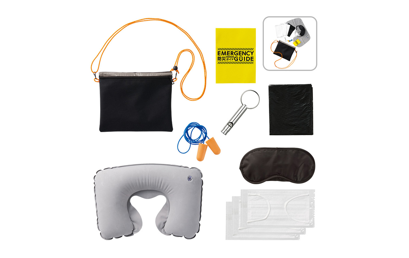 -   防災緊急10点セット シートインサコッシュタイプ ブラックサコッシュとシートが一体化したオリジナル防災セットです。 一時避難用に役立つアイテムをコンパクトに収納しています。 <セット内容> サコッシュ/シート/ロープ/個包装マスク×3/アイマスク/ホイッスル ゴミ袋/耳栓/ネックピロー/防災ガイド 70mlのゴミ袋は着替えの目隠し用などにもご活用いただけて便利です。 サコッシュのポケット面と中のシートにも名入れが可能で、オリジナル備品やグッズとして、また防災キャンペーンにもご提案いただけます。