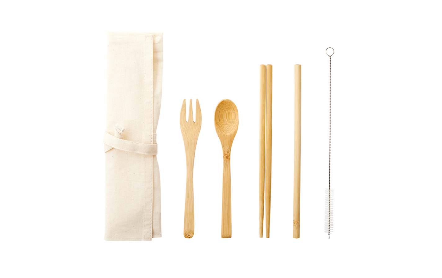 環境にやさしい竹を使用したバンブータイプのカトラリーセットです。 普段よく使うスプーン、お箸、フォーク以外にストローとストローブラシのセットとなっており、 繰り返し使用できるのでプラ削減ができるエコ商品です。 バンブーストローは、長時間使用してもへたりにくいためストレスになりません。 紐付きのカトラリー袋を付属しており、 持ち運びの際はカトラリーを袋に入れて紐を括るだけで簡単に持ち運びできます。 素材はアウトドアでも馴染みやすい天然竹を使用しており、ステンレスやアルミと比較すると熱が伝わりにくく、 熱い食べ物でも食べやすいのでお子様も安心してご使用いただけます。 ※竹は天然素材の為、形状や色に個体差が発生します。 カトラリー袋にはシルク印刷が可能となっております。 食料・飲料品メーカー様のノベルティ使用はもちろん、 日常使いするアイテムなのでアーティスト等の物販品としてもおすすめです。 *竹は二酸化炭素を吸収し、栽培の際に人工肥料や薬品を必要とせず、発芽してからたったの3年で成木になります。 非常に生育が早く、植竹は3~4年で伐採ができ、継続的に安定した利用が可能です。 また、伐採した切り株から新たに再生・成長するため植え替えの必要がなく土壌への負担もかからないことから、現在エコ素材として注目されています。