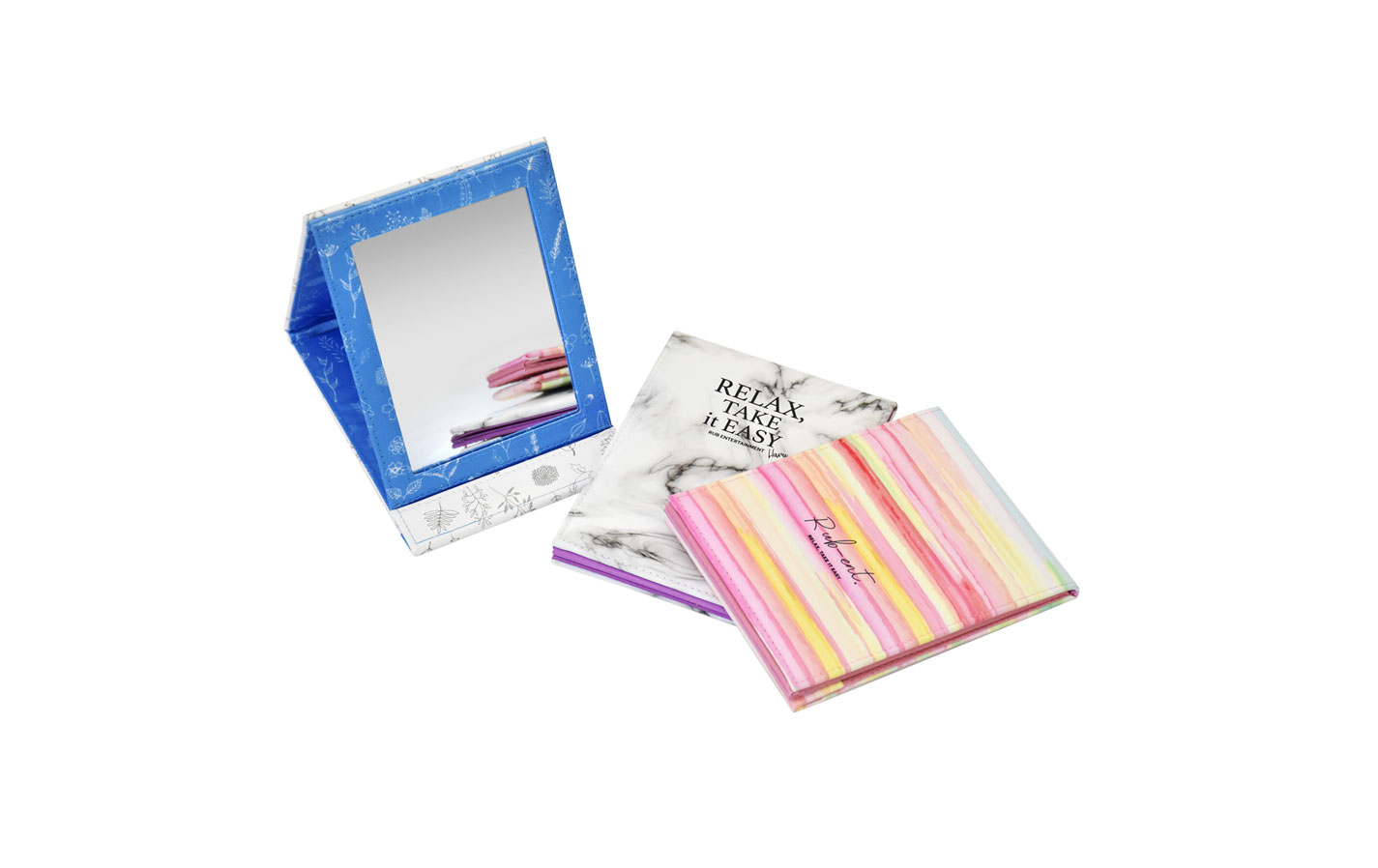 お化粧に便利な大きなサイズの鏡を折りたたんで持ち運べる優れもの! 鏡以外で全部のパーツのプリントや色指定が出来るので、デザインの自由度の高いアイテムです。 厚みのあるケースなので鏡の保護もバッチリです◎