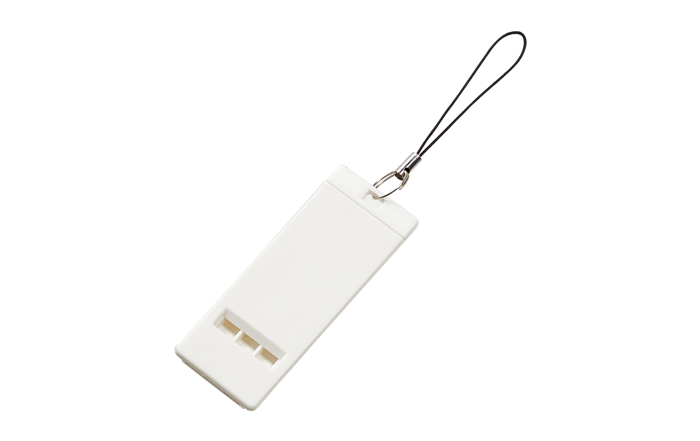 本体全長約7cmの小型ホイッスルです。 携帯やバッグなどにつけて持ち運びができるので、通勤や通学時の防犯や防災に役立ちます。 カラーはブラック、ホワイト、オレンジの3色からお選びいただけます。 単色印刷からフルカラー印刷まで対応しており、お好きなデザインでオリジナルグッズをお作りいただけます。 販促品としてはもちろん、学校や施設などの備品としてもおすすめの商品です。